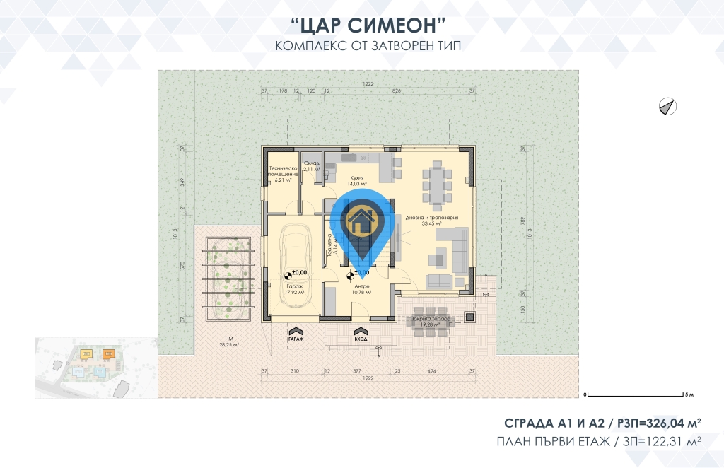 Дневна с трапезария, Кухня, Склад, Техническо помещение, Антре, Санитарен възел, Гараж с топла връзка