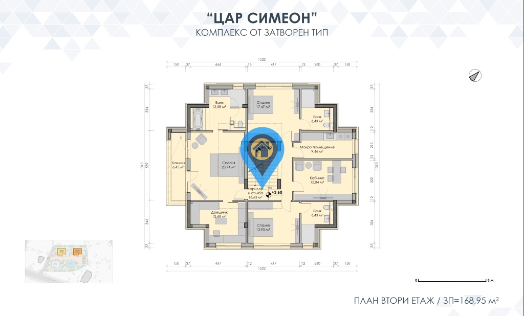 Втори етаж : Застроена площ :168,5 кв.